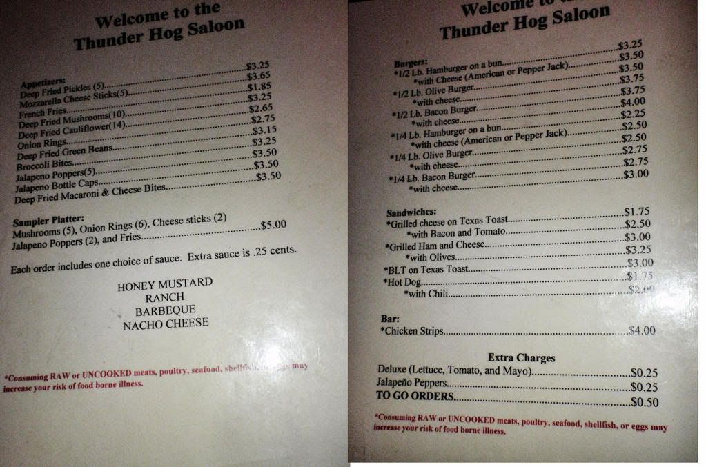 The Thunder Hog is a dive bar in every sense of the word. After you make your way in, the bar and dining area is to your right. To the left is a pool table and a stripper pole. Yup. A stripper pole. There’s a juke box tucked away in the corner and the only TV was turned to SPEED. There was a large group sitting at a table by the door, so we headed to an empty table on the other side of the room closer to the kitchen. There were a few guys at the bar shootin the bull with the bartender who yelled over and asked what we wanted. J asked if he had a menu. He said he’d have to look, but a few minutes later, he did produce one. I knew they were doing food because I could see into the small kitchen where there were a number of burgers on the grill.
