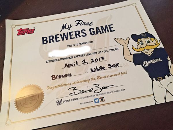I didn’t make it too far around the concourse. I found Guest Services and noticed they had a stack of certificates for kids attending their first Brewers game. I wanted to get one for B because it was his first MLB game so I wanted the souvenir. And of course, since we got one for B, we had to get one for L. I mean, technically, it was her first Brewers game so she got one too.