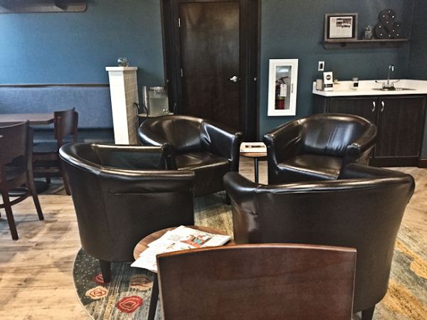 and even a sitting area with leather chairs and copies of the Wall Street Journal.