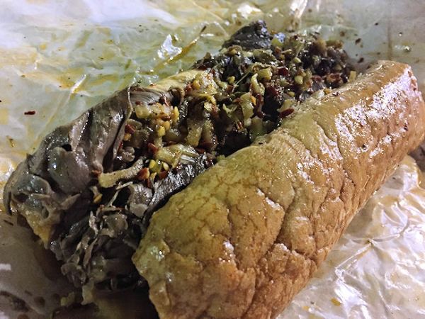 The sandwich comes filled as much as it possibly can be with tender, thinly sliced beef that has been soaking in this very oregano tasting gravy that has soaked through the bun. The meat is heavily spiced before being cooked, but it’s also dry roasted. So much of that flavor comes from the gravy that it is soaked in after it’s sliced. I top my with hot peppers which is a classic mix of pickled veggies and red pepper flakes. The thing I really like about Al’s giardiniera is how finely it’s chopped. You get a good crunch and a lot of flavor in each bit without having to work to open your mouth wide enough to get big pieces of vegetables into a bit with meat and bread.