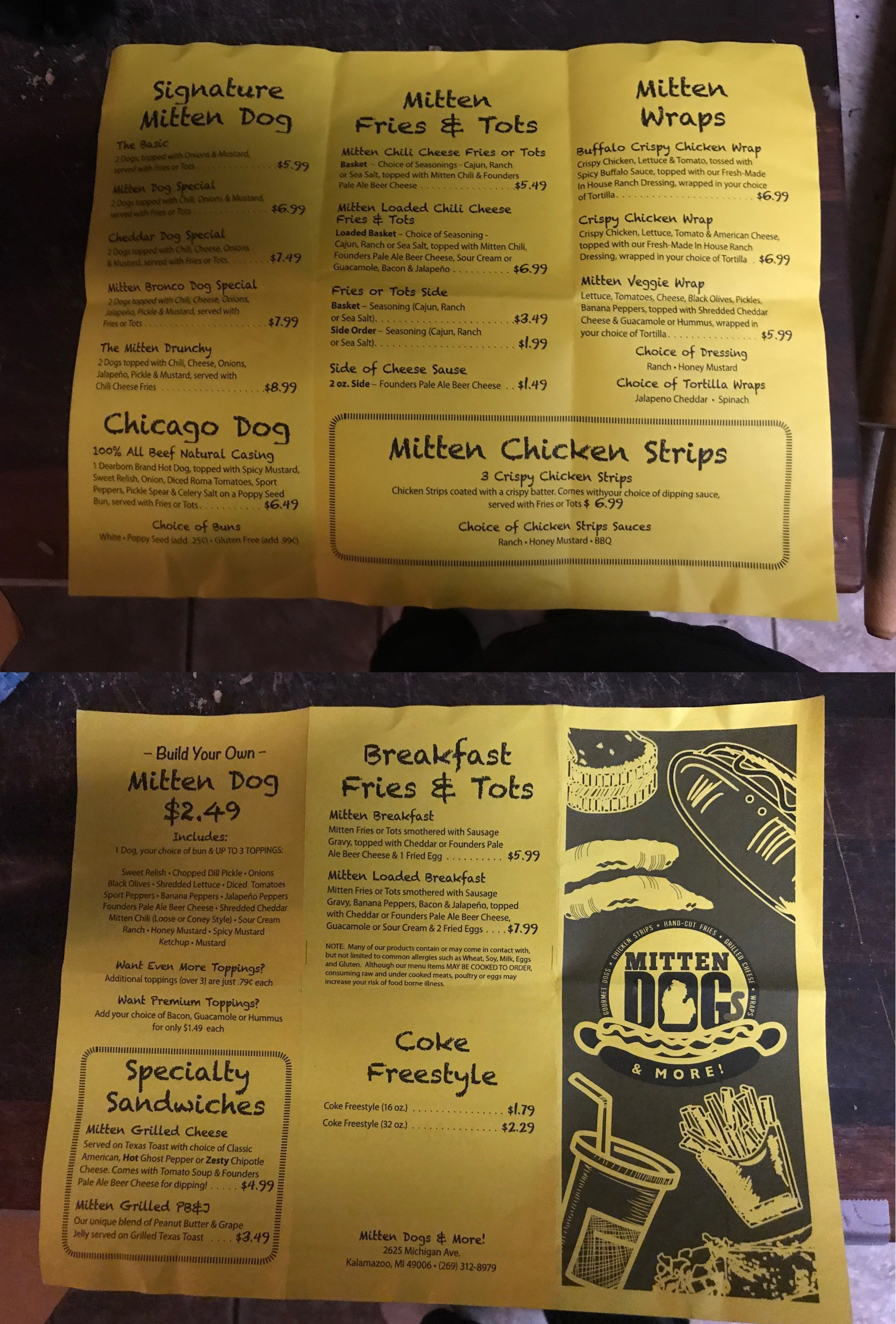 Mitten Dogs and More is right on the corner of Howard and Michigan across the street from WMU’s campus. The small restaurant is in the strip mall on the south side of the road right next to Jimmy John’s. This storefront used to be All Thai and before that, a BoRics Hair Care.
