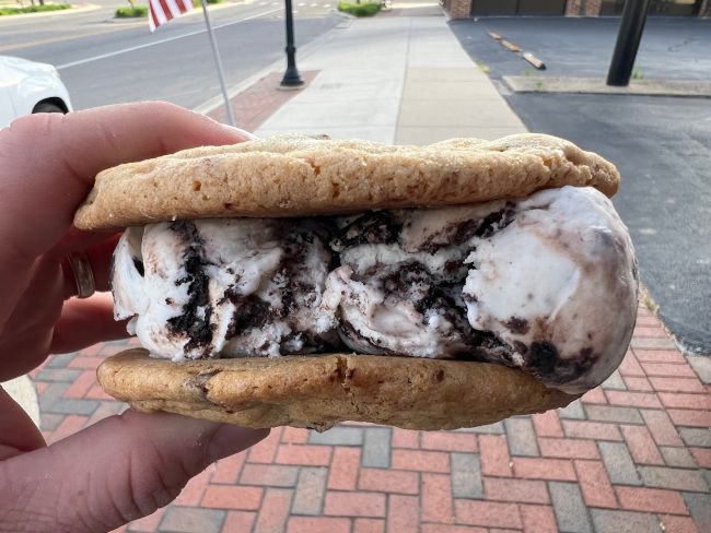 I was on the fence between a shake and an ice cream sandwich. They make amazing looking Freak Shakes but I didn’t really need all that sweetness. I chose the ice cream sandwich instead. You get to choose the cookies…which are made by Two Spoon Bakery in Mendon..and the ice cream they sandwich in between. I stuck to a simple Chocolate Chip Cookie with Cookies and Cream ice cream. I could have had it rolled in some toppings but the cookies and ice cream were enough. The cookies were soft but firm enough to hold up to the hard pack ice cream. The sandwich was huge. Almost too much for one person…but I was able to conquer it.