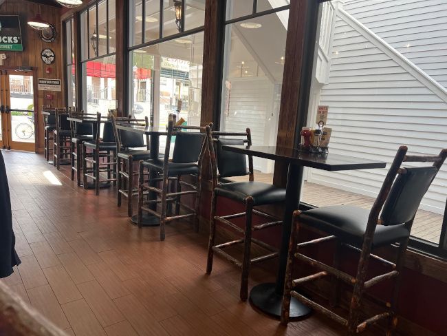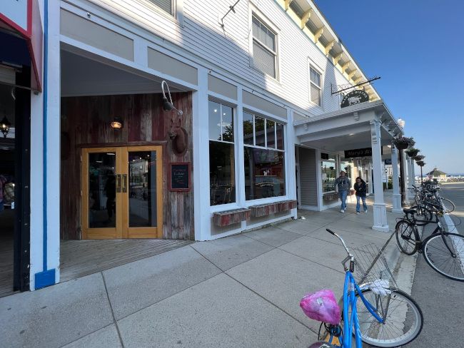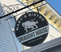 Mary’s Bistro Draught House is on the south end of Main Street on Mackinac Island near French Lane and across the street from the Lakeview Hotel. The restaurant is part of a long two story wood building that spans almost the east side of the block. The entrance to the restaurant is marked by a horse head and is right next to the walkway leading to the Mackinac Island Ferry (fka Star Line) Dock.