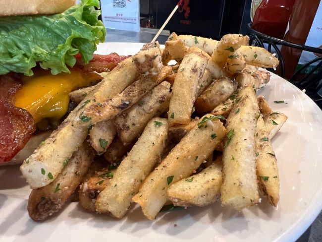 I picked the Bistro Burger. For $18, you get a 7 oz custom blend beef patty, lettuce, and tomato. Everything else is extra. I added on cheese ($1) and bacon ($4) plus added fries. The regular fries are $4 but they have truffle fries for $5. I decided to spend the extra dollar.
