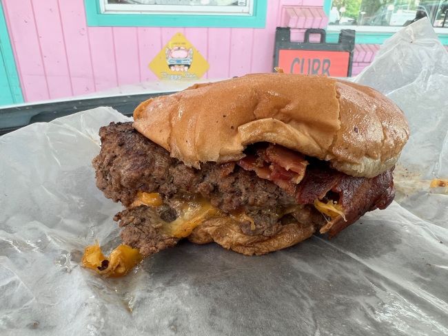 I picked the Big D 1/2lb Burger. I added on cheddar cheese and bacon plus made it a basket. The sandwich that came out isn’t the prettiest burger you’re ever going to see, but oh man, was it good. The burger patty was so tender, so juicy. Wrapping the sandwich in wax paper softens the bun up so it doesn’t keep it’s shape but just makes biting through the sandwich a nostalgia inducing experience. This was so much better than any fast food burger we could have gotten along the way.