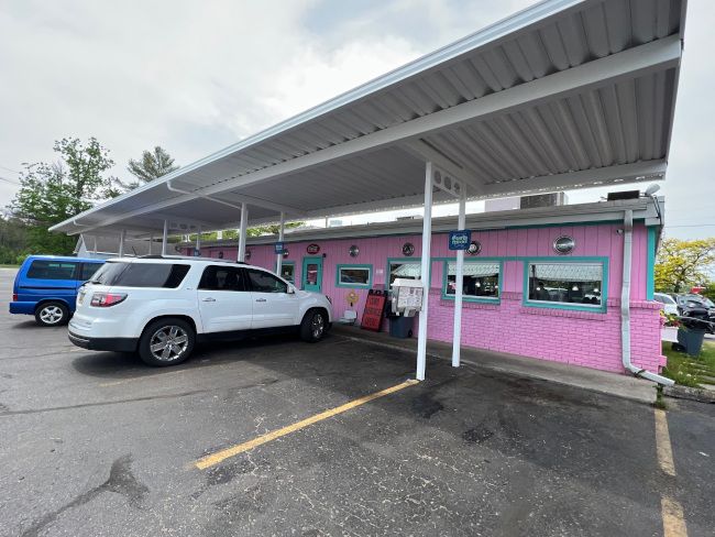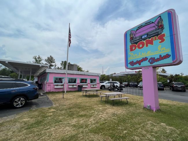 Don’s Drive-In is on US-31 near Four Mile Road in East Bay Township just to the east of Traverse City proper. The drive-in, which has been there over 60 years, sits just across from Grand Traverse Bay in a bright pink building.