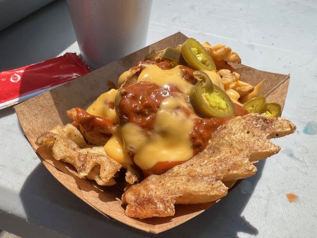 I ordered the Waffle Fry Supreme when I went to get L’s walking taco. This is a small boat of waffle fries topped with chili, jalapenos, nacho cheese, and sour cream. The sour cream was served in a packet on the side so I didn’t put it on…I don’t like sour cream anyway so I was happy it was done this way. The fries kind of work in place of tortilla chips as these fries are more like nachos. The chili is a really loose, spicy chili and the cheese is the stuff you get out of the can but it’s a classic concession stand flavor combination that I look forward to when I order from a window like this.