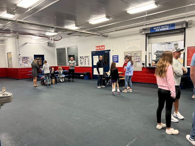 The seating is plastic bleacher on concrete. The little kids starting skating learn quickly they need to put guards on to come find mom or dad in the stands. The heat isn’t always on when the kids are practicing but it was on for the competition so it was actually pretty comfortable in the seating area.