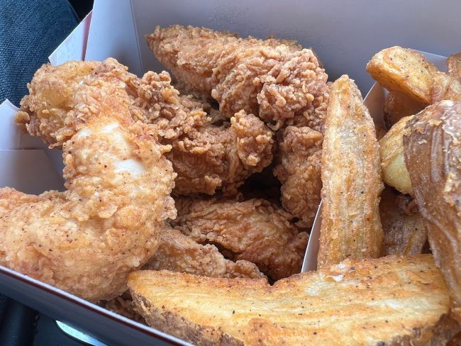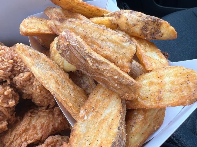 I ordered 8 tenders and a small side of wedges. I was hungry havev missed breakfast and lunch so I went bigger than I needed to. The chicken was boxed up then I grabbed a couple of Pepsi’s from the cooler and headed to the front cash register to pay. The total for the chicken and the wedges was a little over $12.