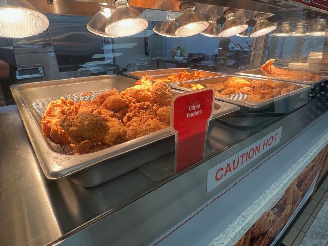 Like most gas station chicken places, the chicken is already cooked and under warming lamps waiting.