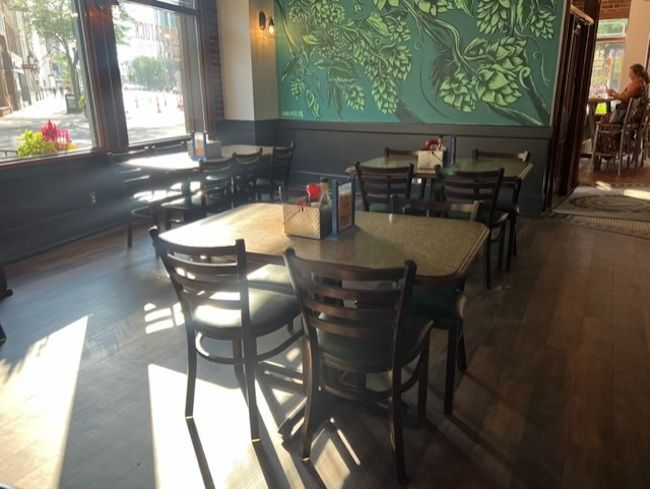 The other room is the main dining room. It’s away from the bar and has much more restaurant feel to it. There is a lot of natural light coming in to this room from large windows looking out on to Portage Street to highlight the old wood floors and other original parts of the building.