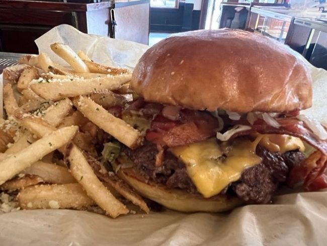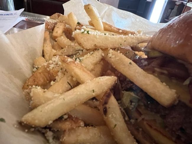 The Double Smash Burger is two patties topped with American cheese, pickles, shredded lettuce, and “Secret Sauce.” I added on bacon for an extra $2 and upgraded my chips to Parmeasan fries….so the meal wasn’t quite $14 with the add ons.