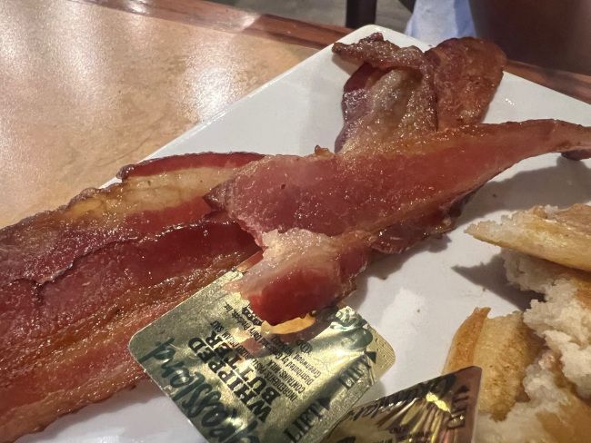 For his meat choice, he got bacon. There were three super crispy strips on bacon on the side. He ate two of those strips then offered the third one to me. He was really trying to push me along. He had video games to pay and prizes to win.