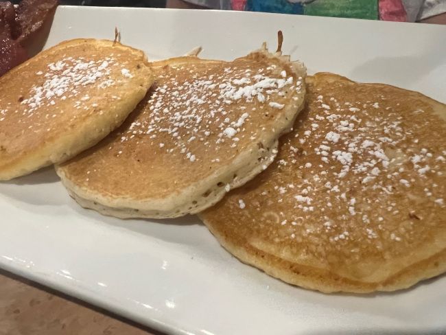 The Lil’ Mates pancake option is 3 Silver Dollar Pancakes with choice of meat. B had already eaten a yogurt at home before I got up so he wasn’t super hungry. He ate one of the pancakes after I ripped it in to pieces for him so he could dunk it in syrup.