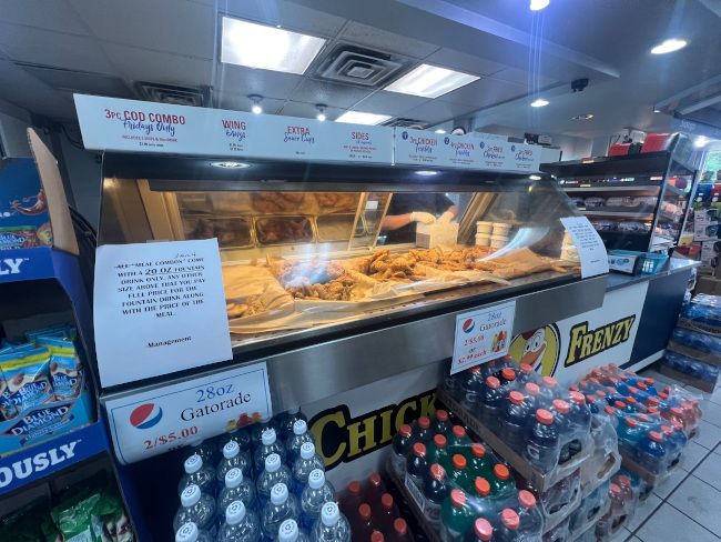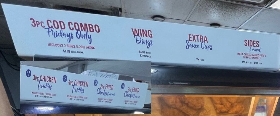 The gas station is pretty tight but there’s a food area in the back. The chicken is all in a display case with warmers. Nothing unusual for a chicken place in a gas station. The only menu I could find was combos listed above the warming cabinet.