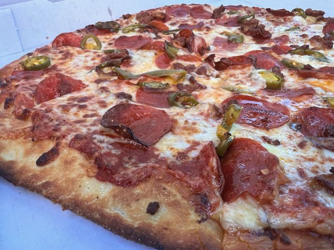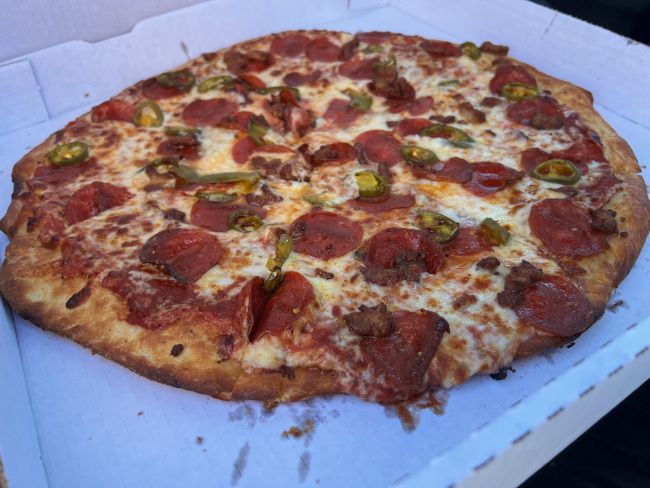The pizza was delicious. The pizza is a thinner crust with a thick, sweet sauce. The cheese, meats, and jalapenos are heavily layered on top. The pizza is thin enough that you can snap it over to eat like a New York slice but it’s thick enough to hold up to the weight. The reason I said it wasn’t a great idea is because it was pretty greasy….but that’s to be expected with a lot of meat. It was a delicious, sweet, greasy pizza….but I was trying to eat in the car and my shirt ended up with enough grease on it that I had to change before I headed to my job site that evening….lucky I had an extra shirt in my car.