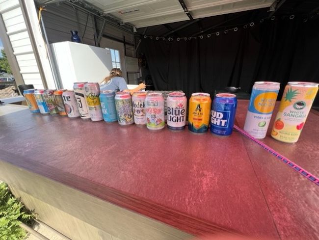 The outdoor bar has a number of different can options for drinks. There is beer, cider, and wine to choose from. B originally asked for a Sprite but I didn’t see and I didn’t ask. This area is pretty much just a garage they open up with a refrigerator. I do wish they had a full bar with taps out here but you can always go inside for drinks and I assume I could have gotten B a Sprite inside.