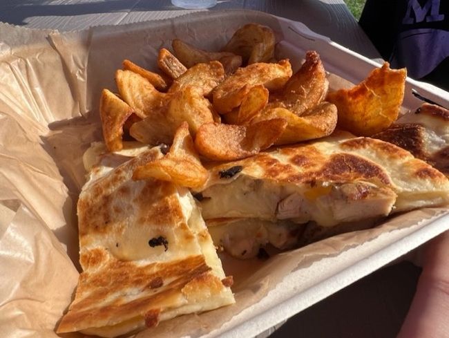 B was not interested in eating but of course we made him. He picked the Ooey Gooey Cheesy Chicken Quesadilla. We missed the chicken part which is right in the name. For a kid’s meal, he got a ton of food. There was a huge quesadilla and just about as many of the sidewinder fries that I had in my meal. He took a few bites of the quesadilla and kept complaining about it “tasting funny.” We decided not to argue with him at the time and go play. I took this home because there was a lot of food left. When I heated it up the next night, I realized there was chicken in it so it probably did taste funny to him. I thought it was tasty though. It was a great late night meal after work a couple of nights later.