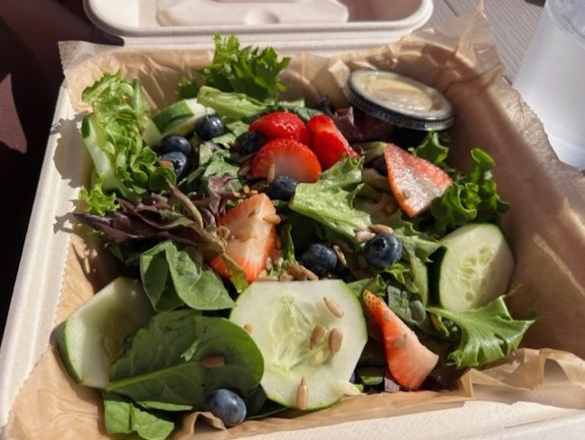 J ordered the Two Berries Met in the Yard Salad. This salad is a romaine and spinach mix topped with strawberries, blueberries, cucumbers, red onions and sunflower seeds tossed in a citrus vinaigrette. J loves any salad with fresh berries and this one called to her right away. It was missing any sort of cheese though. Not sure if I missed that as an add on when I was ordering. J didn’t say anything about it but she usually likes a feta with this kind of salad.