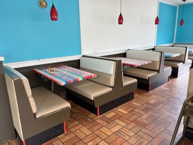 There are two seating areas in the rest of the restaurant. It’s a bi-level seating area with booths covered with a Latin American themed table cloth next to a wall painted with the colors of the Guatemalan flag. on the upper level even with the order area.