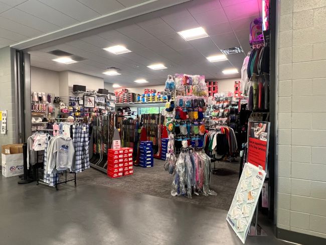The main floor has a pretty large pro shop called Offensive Zone. It’s mostly hockey stuff but they do have gear for figure skaters. There are boxes of Edea, Jackson, and Ridell skates sitting on the floor. They also do their own heat transfer shirts. It’s mostly used for hockey jersey’s but they had the NSD logo and were making shirts. They actually ran out of shirts by Friday but told us if we went and bought a shirt somewhere, they’d press it for $6. J ran to Target and got a t-shirt and a crop sweatshirt and brought them back. We got two shirts for under $50. We typically pay over double that for competition apparel.