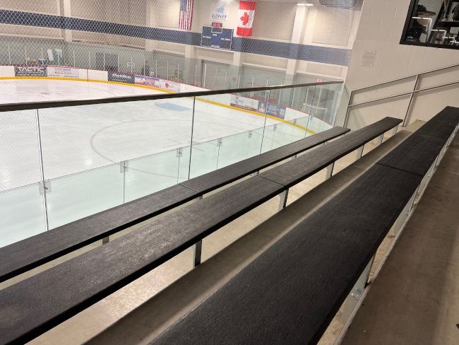 All of the seating is upstairs above the rink. This is really my only complaint about the whole weekend. I hate places that do seating like this. You can’t see the whole ice surface. If the skaters are up against the near boards, you lose them. If they get in to the corners, you lose them. The bleachers were also really hard and there was too much room between them to lean back comfortably. A lot of the girls were sitting on the cement part and putting their legs underneath the bench seat. That made it a little more comfortable for the long periods we all sat there and they could more comfortably lean back. They also left the hockey netting in place which is kind of annoying. Kalamazoo has hosted this same event in the past but the club hosted it at Wings Event. Whenever GKSA hosts big events like that, they take down the plexiglass and the netting surrounding the rink for unobstructed views.