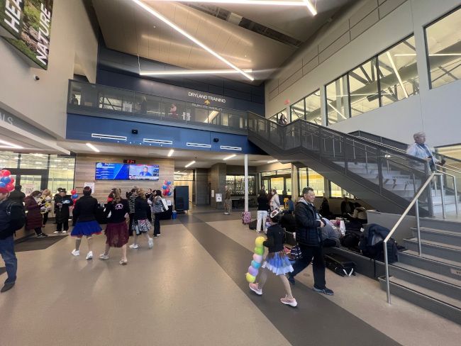 We walked in the front doors to find a massive atrium area. All of the seating is up a level while locker rooms and ice surfaces are on street level. We got L checked in, got her NSD jacket, then we headed upstairs to watch *a lot* of ice dancing.