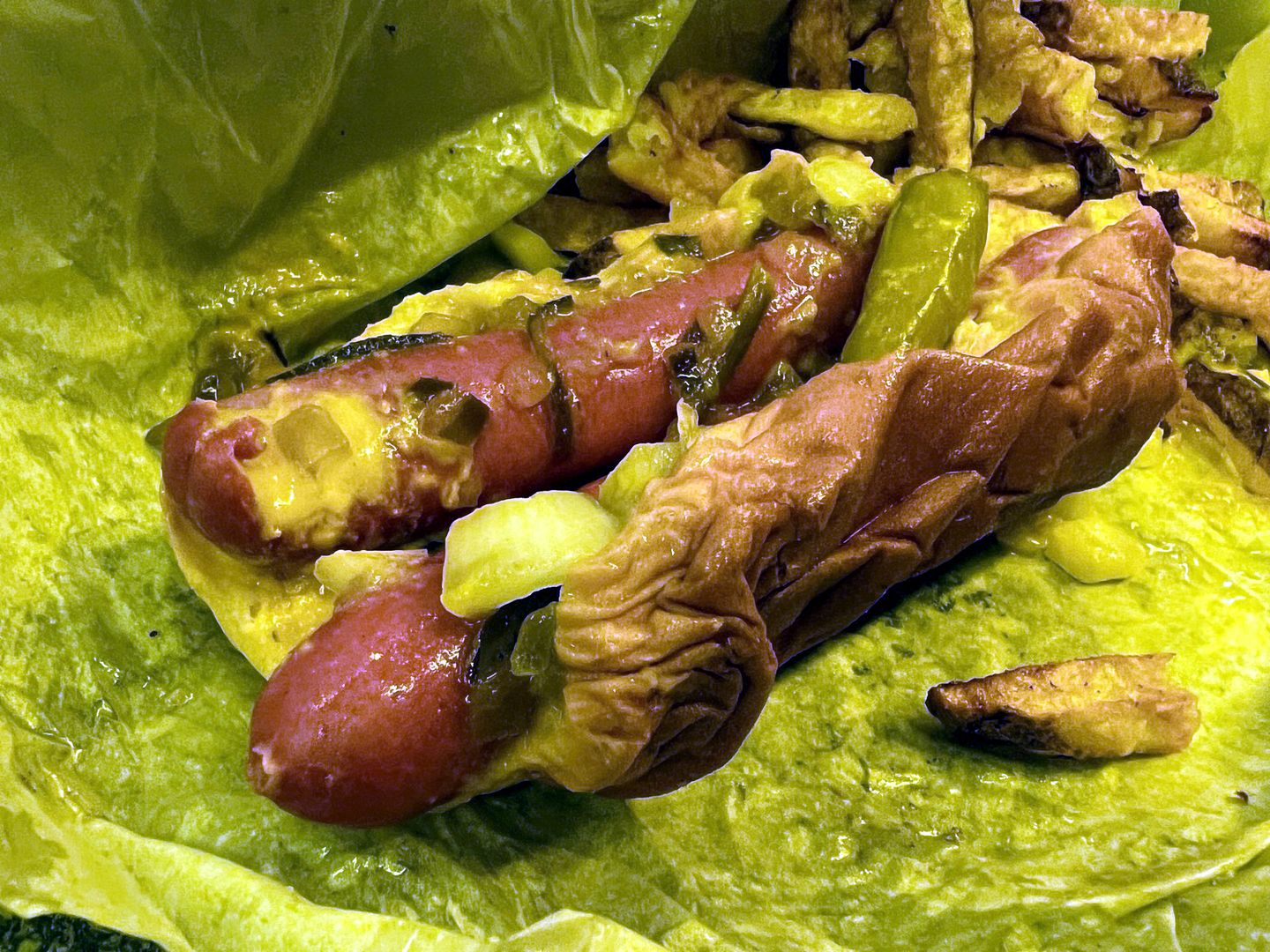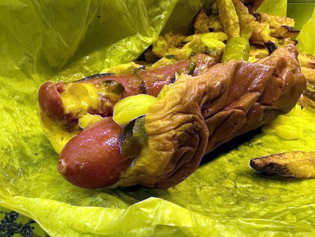 Gene & Jude’s hot dog is the quintessential Chicago dog. It’s served on a soft, simple steamed white bread bun topped with mustard, relish, onions, and sport peppers. Some Chicago dogs will add tomato and pickles, this one does not. Some will also use a poppy seed bun. This one does not.