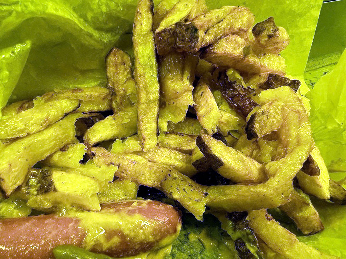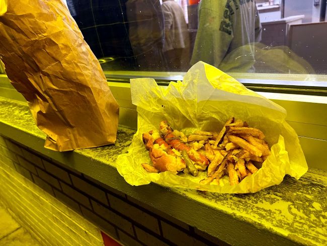 When it got to be my turn, a guy turned around from the fryer and pointed at me. I told him I wanted a double dog with fries. His only question, “What on the dog?” I just said everything and he went to work. He grabbed a bun and two red hots. Put them on the same bun, brushed on some mustard, then topped with onion, relish, and sport peppers. He put the dog down on a piece of paper then dumped fries on top of it before wrapping the whole the thing up and handing it to the cashier. The cost was just under $7. I paid with cash then headed outside to eat.