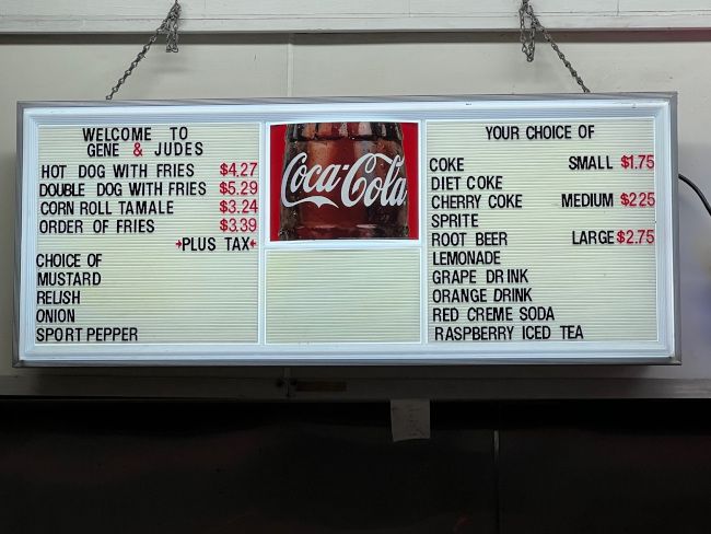 The menu is small….like, really small. The only options are hot dog w/fries, a double dog w/fries, an order of fries, or a corn tamale. That’s it. There are more pop options listed on the menu than there are food. Gene & Jude’s basically does one thing and does it well enough that there is a huge line wanting hot dogs at 11:00 at night.
