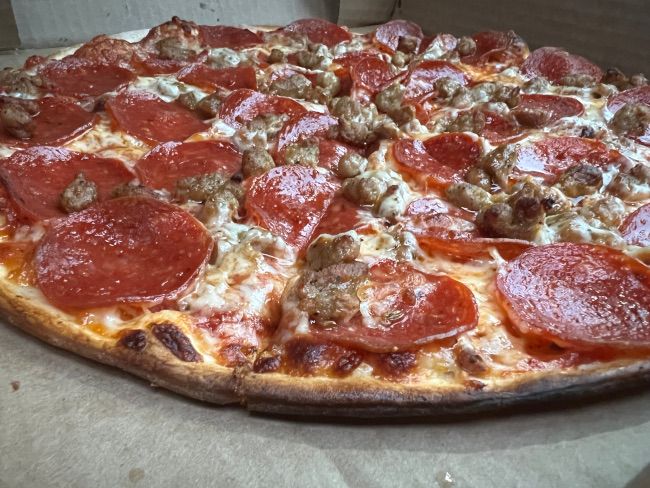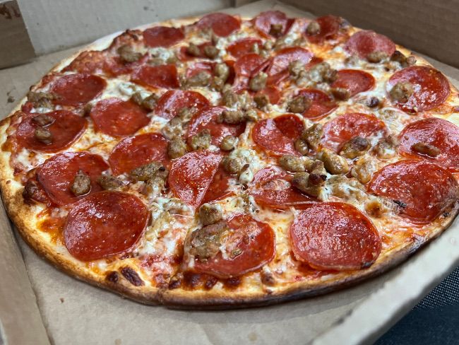 There’s no online ordering which sucks for my anxiety. I sucked it up and called in an order for a medium thin crust pizza with Italian sausage and pepperoni. They told me it would be about 45 minutes so I grabbed a Pepsi and filled up my gas tank at a nearby gas station then hung out in the parking lot.