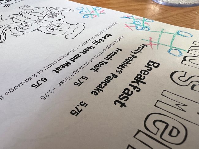 We got a Coke and a Sprite while we looked over the menu and, of course, played tic-tac-toe on the kid’s menu.