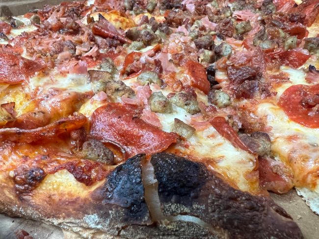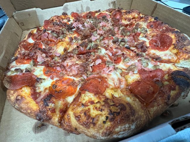 There was a lot of meat on top of the pizza and that’s where most of the flavor came from. The pizza was heavily topped with sauce and cheese as well but the sauce didn’t really have much flavor to it. It was just kind of there. The crust is a little thicker consistent with typical carry-out/delivery pizza. It’s soft and chewy giving the pizza that extra texture. Getting a pizza with all meat makes these pizza a little saltier and that was definitely the dominant flavor profile. Delicious, salty, crunch meat.
