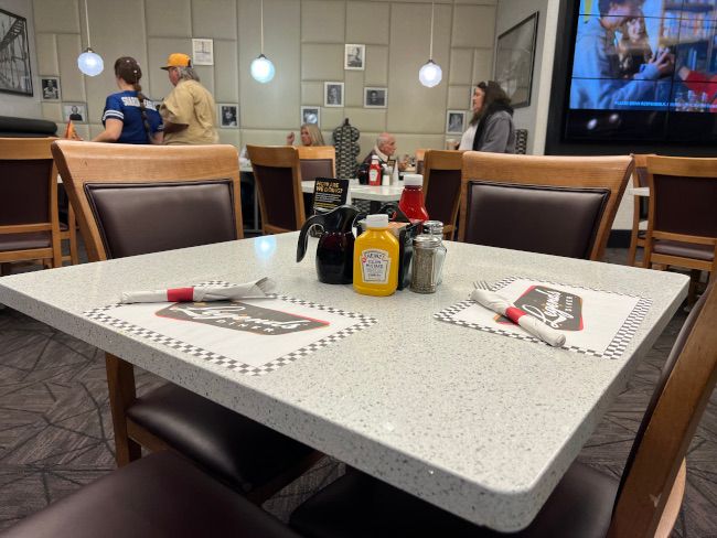 Legends Diner looks like a classic diner despite being in the middle of a casino. It has a sort of 80’s vibe to it instead of the usual 60’s diner aesthetic. The design has very clean lines with a little bit of modern flare. There’s not much color. The floors are an off whit tile while most of the accent is black. There is a little bit of green just to break things up. There’s a mix between booths and tables all that have a few of a giant TV wall where the Michigan State game was playing.
