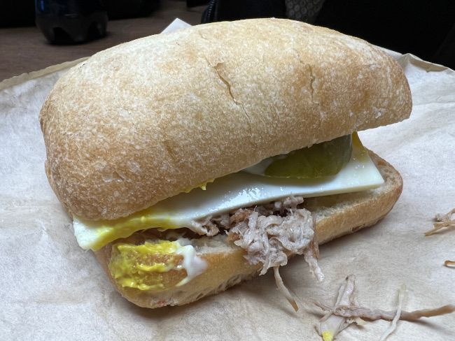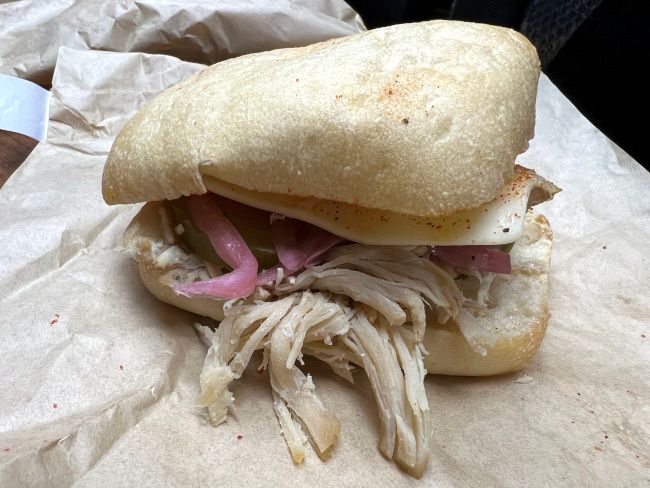 The second sandwich I got was the Pork Duo. This sandwich is pulled pork, bacon, mustard, go-go sauce, pickles, green onion and Swiss cheese. Again, fine enough sandwich but nothing that really pops. The bacon is a little rubbery from sitting in a tray most of the day. The pulled pork is fine but doesn’t have a ton of flavor. This sandwich tastes more like an upressed Cuban with the mustard and pickles.
