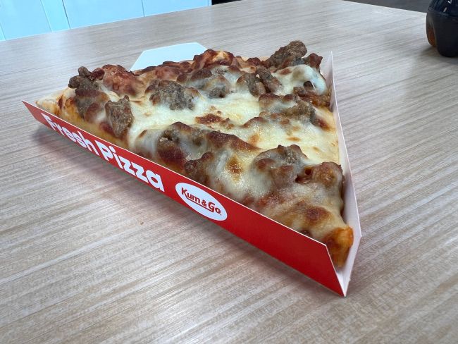 The pizza is pretty typical of gas station pizza. It’s a real doughy crust with not a lot of sauce. There is a lot of sausage though and that’s where the majority of the flavor comes from. The lack of sauce actually makes it better to eat on the go pizza as you don’t have to worry about dripping down the front of your shirt.