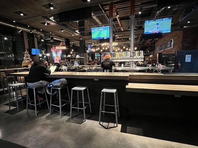 The space is pretty typical for a brewery. It has a modern flare with concrete floors, mostly of pub tables and minimalistic furniture. The place was still decorated for Christmas which some additional light to the single bulb lamps hanging from the ceiling.