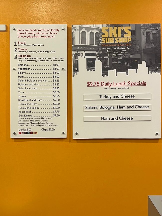 Ski’s Sub Shop is in the Founders Building in downtown Grand Rapids on Monroe Center NW just to the east side of Ottawa Avenue. The shop has been downtown since the late 1970’s, in it’s current spot since 1986 and claims to have the “Best Lunch Deal in Downtown Grand Rapids.”
