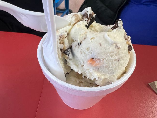 The kids still really like getting scoops. The ice cream they have is Ashby’s. We let be get the smallest cup possible because this kid still struggles to not get ice cream all over himself.