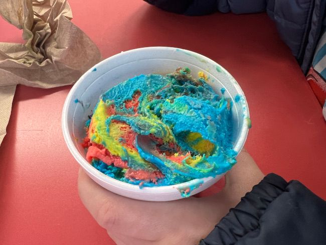 B stuck to his regular. He got Superman. He usually does Blue Moon too but we kept it to one scoop so he wouldn’t make as big of a mess.
