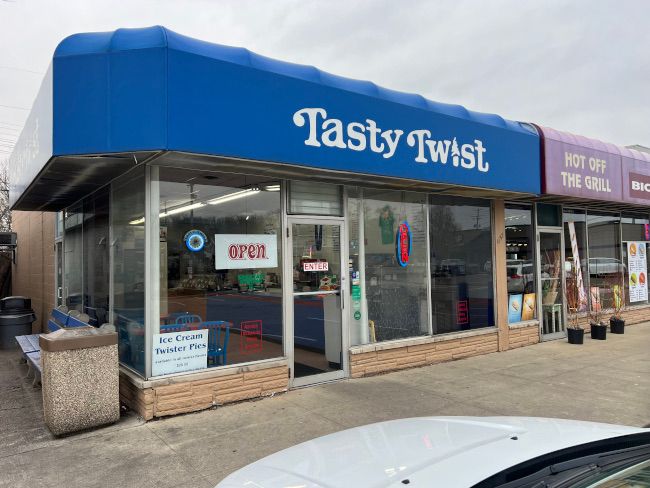 We headed towards Tasty Twist on Grand River Avenue near Stoddard Avenue across the street from MSU’s main campus. The small ice cream shop shares a building with a Korean take out place. It’s right next to the pretty popular with college kids Bell’s Greek Pizza. It’s a little bit of a dated building but it’s easy to spot with a large blue awning with the white Tasty Twist lettering right above the door.