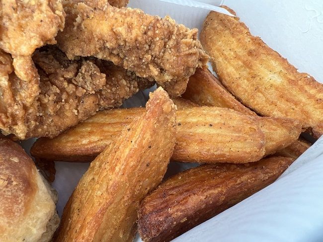 I started with the chicken when I got back to the car because the wedges were too hot to pick up.