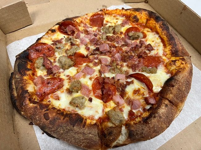 I decided just to keep it simple and order the Meat Lovers Signature Pi. The guy making the pizza grabbed a pizza peel with a 10″ crust all ready to go. He topped it with the red sauce, mozzarella cheese, pepperoni, ham, sausage, and bacon. He did ask if I wanted anything else on it before going in the oven. There are a lot of the typical pizza toppings to choose from underneath a glass door that opens up when they need to access. It’s not like the other quick fire pizza places that have everything sitting out like it’s a Subway line.