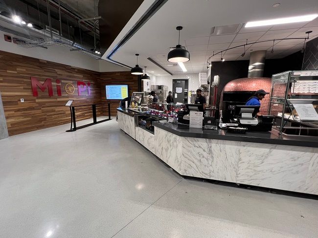 I decided to stop at Mi Pi Pizzaria. The quick fired pizza shop is on the bottom floor of the new student center next to Fuego Verde in a small food court like area.