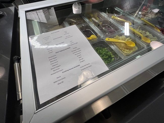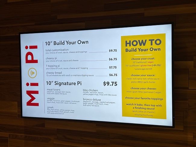 The menu is on a video screen in the queueing area. It’s pretty small. They have a “Signature Pi” option but you can also do a “Build Your Own.”