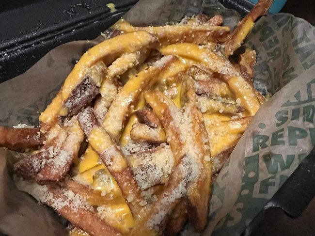 When I got home, I started with the fries. I actually added cheese sauce to them for an extra buck and the Parmesan fry season for an extra $.10. The fries are delicious fresh cut fries that have a crispy exterior and that light, fluffy inside. There was a lot of cheese sauce spread on top which did make the fries a little bit soggy. That was fine. I was at home so I grabbed a fork. There are a lot of fries in the order too so even though 10 wings doesn’t seem like enough, they make up for it with fries.