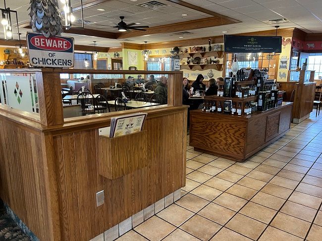 The dining room is pretty large and covered with chicken related decor. It’s a bright, homey dining area that has the feel and comfort of your grandma’s kitchen. The space is kind of divided up in to two areas with a large dining room with larger table configurations in the middle. It’s surrounded by another area with more booths and smaller four tops that can be pushed together for the after church Sunday breakfast crowd.
