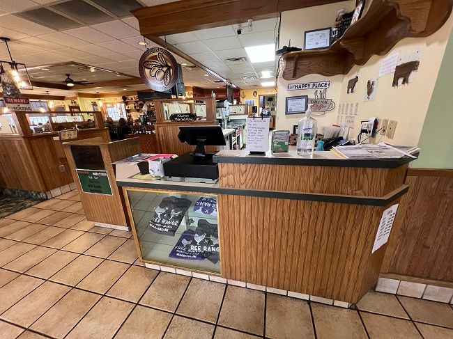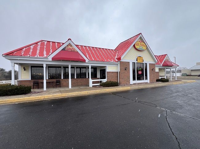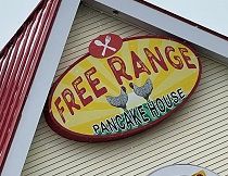 Free Range Pancake House is right off the I-94 interchange at US Highway 27 in Marshall. The free standing building is on the north side of the highway heading away from town. The building shares a parking lot and the big highway sign with the large gas station next door so it’s easy to spot even before you get off the Interstate.