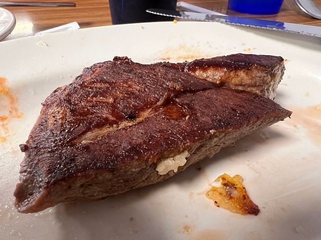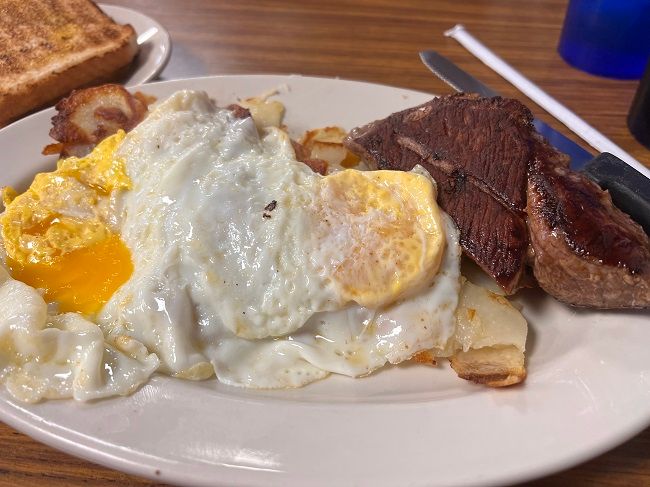 I ordered the Sizzler Steak with two eggs, and potatoes. I ordered the steak medium, the eggs over medium, and the potatoes as American fries. It’s easily the most expensive thing on the menu at just $15.40, but it was the special that day so I got even a few bucks cheaper.