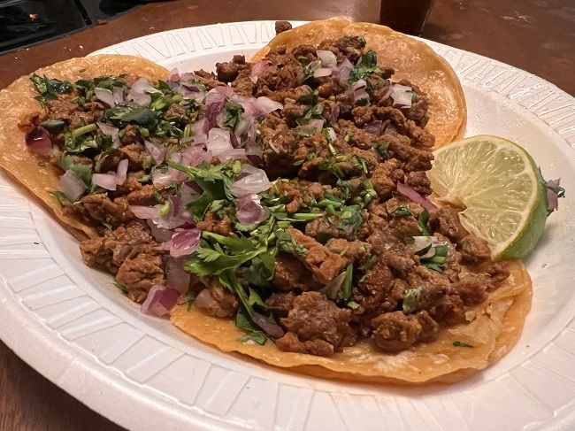 I ordered three steak tacos with corn tortillas and topped with cilantro and onion. I threw the paper plate in the microwave for 30 seconds to warm everything back up then poured on the hot sauce that came with them. Even after a little nuking, these tacos were tasty. There was so much meat on each on that there was no way to keep it all in the tortilla. I almost had enough meat for a fourth taco when I got done. The hot sauce was hot but not overpoweringly how. I could eat thousands of tacos like this and never get tired of tacos. They’re so good.